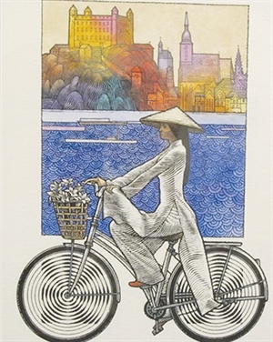 He had never been to Vietnam earlier, but painted a Vietnamese woman with his imagination. This resulted in the painting of a young woman in ao dai (traditional women dress), riding a bicycle across the river Danube.