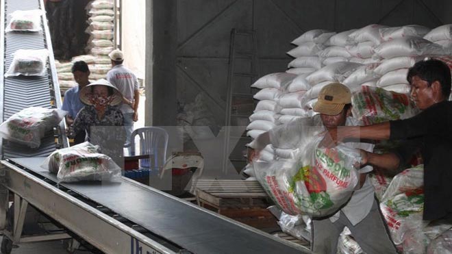 | Rice sacks are loaded onto a truck at a food processing company in Ho Chi Minh City's Binh Chanh district (Photo: VNA) |