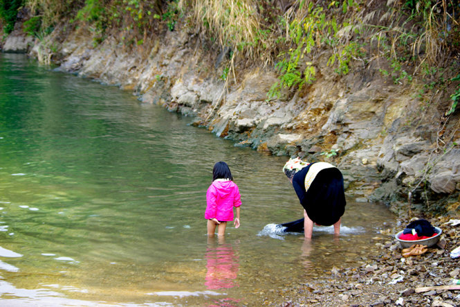 Grandmother and granddaughter washing clothes |